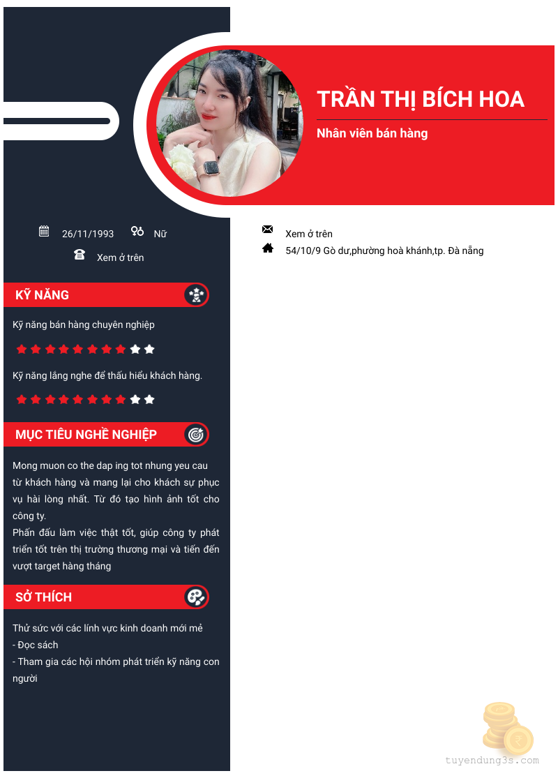 Mở xem thông tin đầy đủ ứng viên TrẦN Thị Bích Hoa chỉ với 2 điểm. Ứng viên được cập nhật ngày 25/02/2026