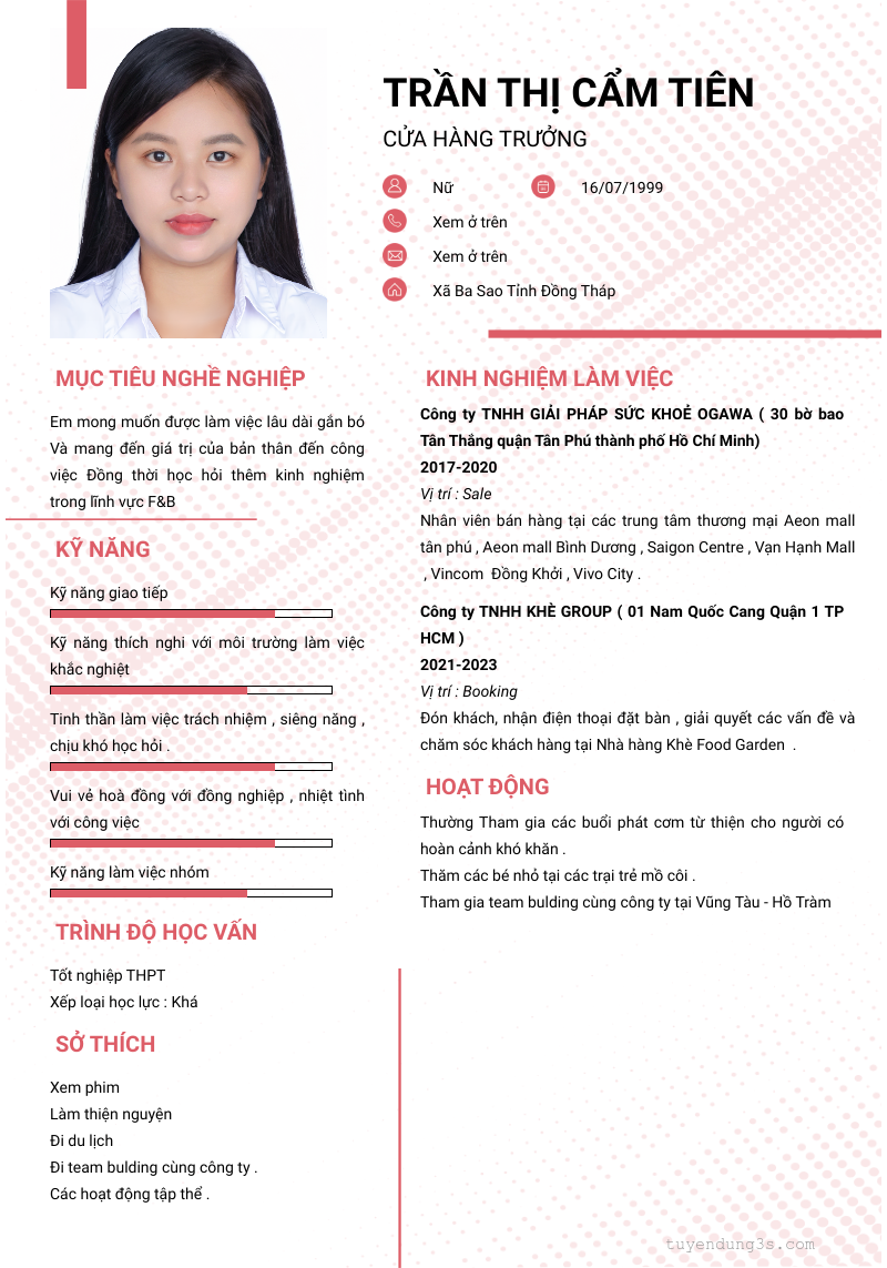 Mở xem thông tin đầy đủ ứng viên Trần Thị Cẩm Tiên chỉ với 2 điểm. Ứng viên được cập nhật ngày 04/11/2025