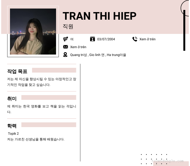 Nơi ở hiện tại: Quang tri성 , Gio linh 면 , Ha trung마을