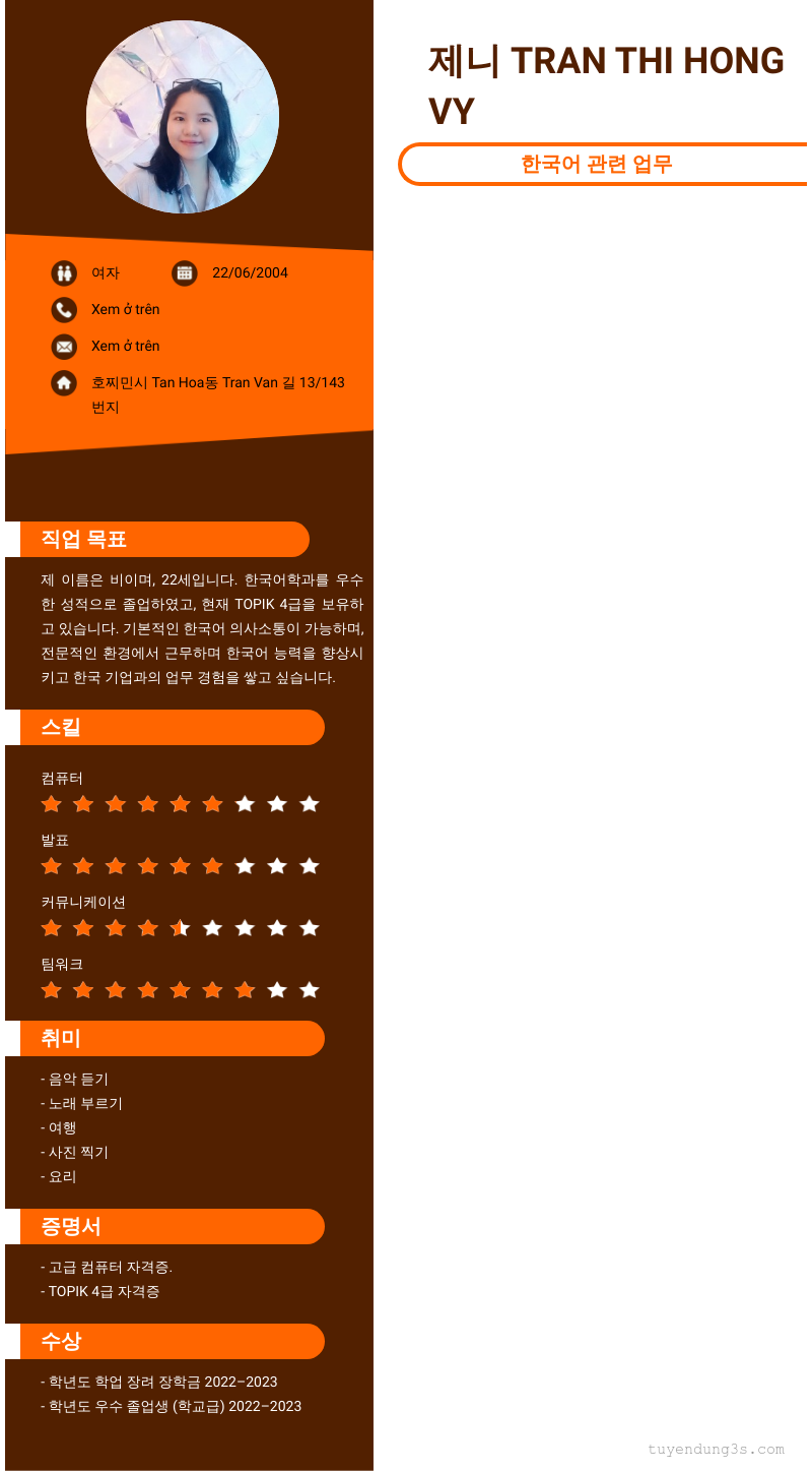 Mở xem thông tin đầy đủ ứng viên 제니 TRAN THI HONG VY chỉ với 2 điểm. Ứng viên được cập nhật ngày 16/12/2025