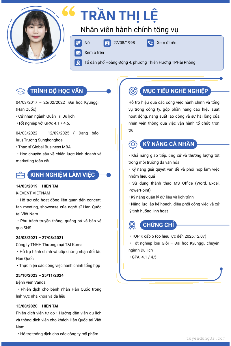 Mở xem thông tin đầy đủ ứng viên TRẦN THỊ LỆ chỉ với 2 điểm. Ứng viên được cập nhật ngày 20/10/2025