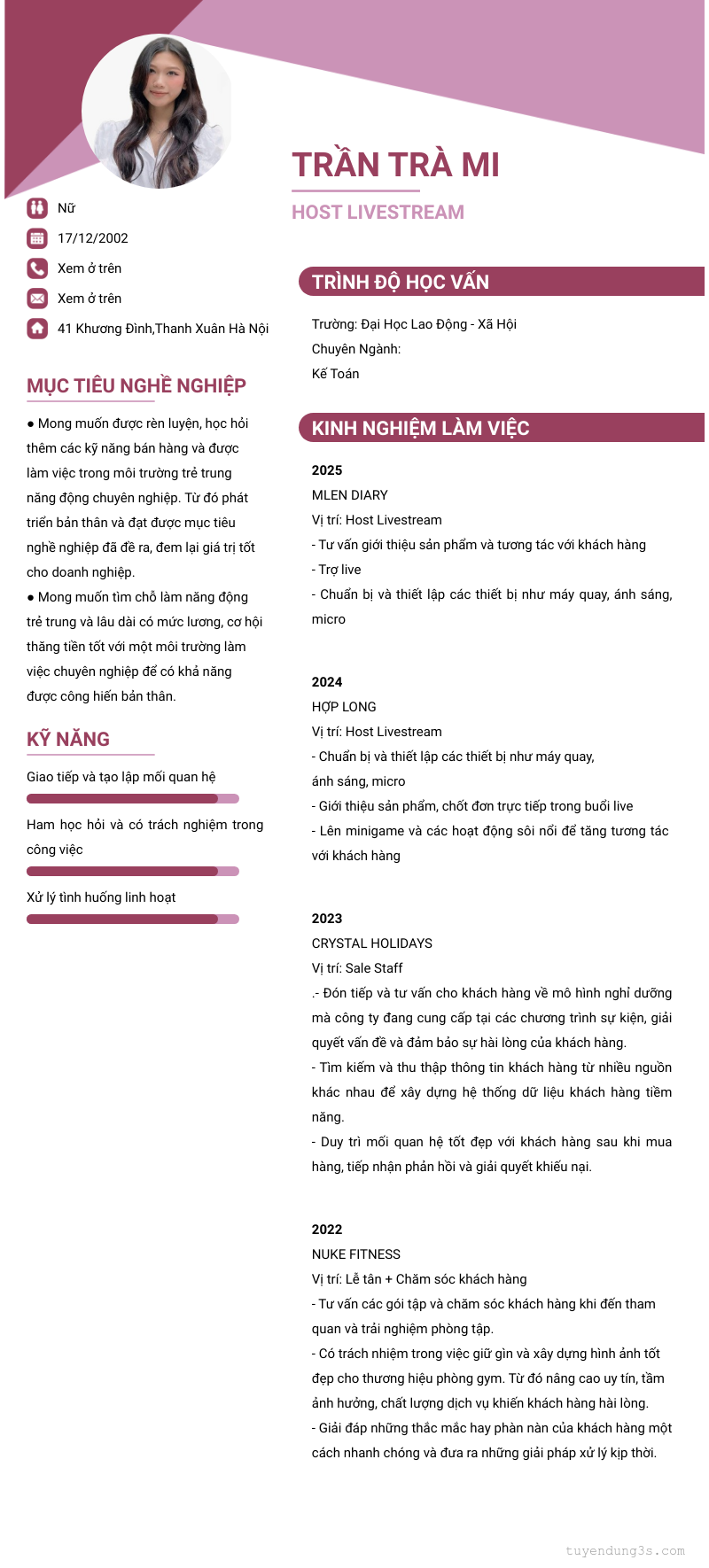 Mở xem thông tin đầy đủ ứng viên TRẦN TRÀ MI chỉ với 2 điểm. Ứng viên được cập nhật ngày 17/10/2025