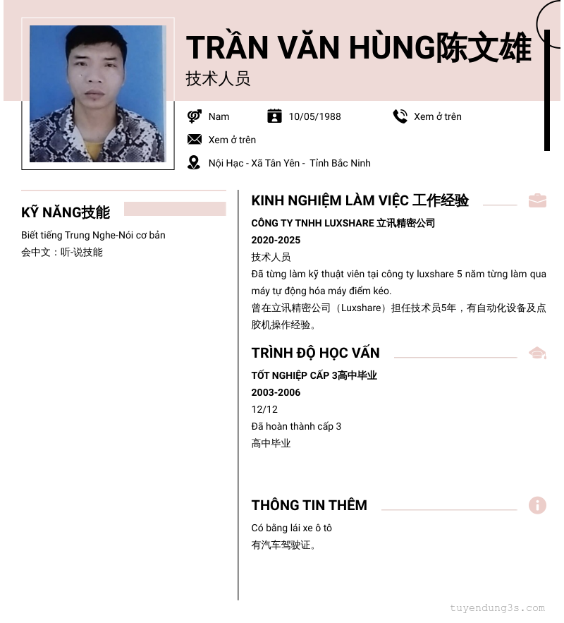 Mở xem thông tin đầy đủ ứng viên Trần Văn Hùng陈文雄 chỉ với 2 điểm. Ứng viên được cập nhật ngày 05/02/2026