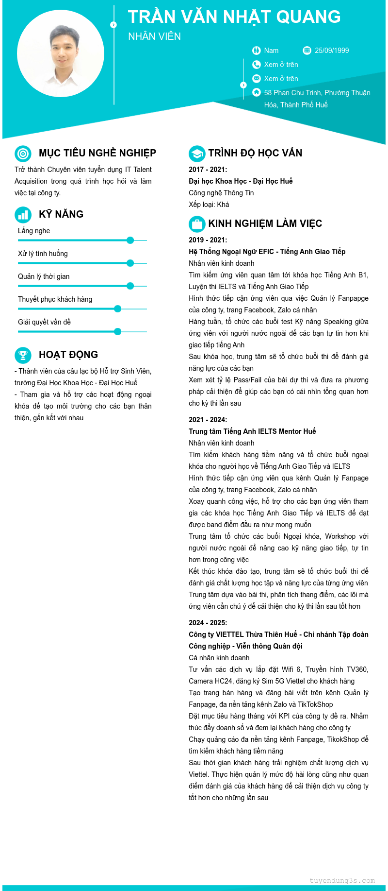 Mở xem thông tin đầy đủ ứng viên TRẦN VĂN NHẬT QUANG chỉ với 2 điểm. Ứng viên được cập nhật ngày 13/11/2025