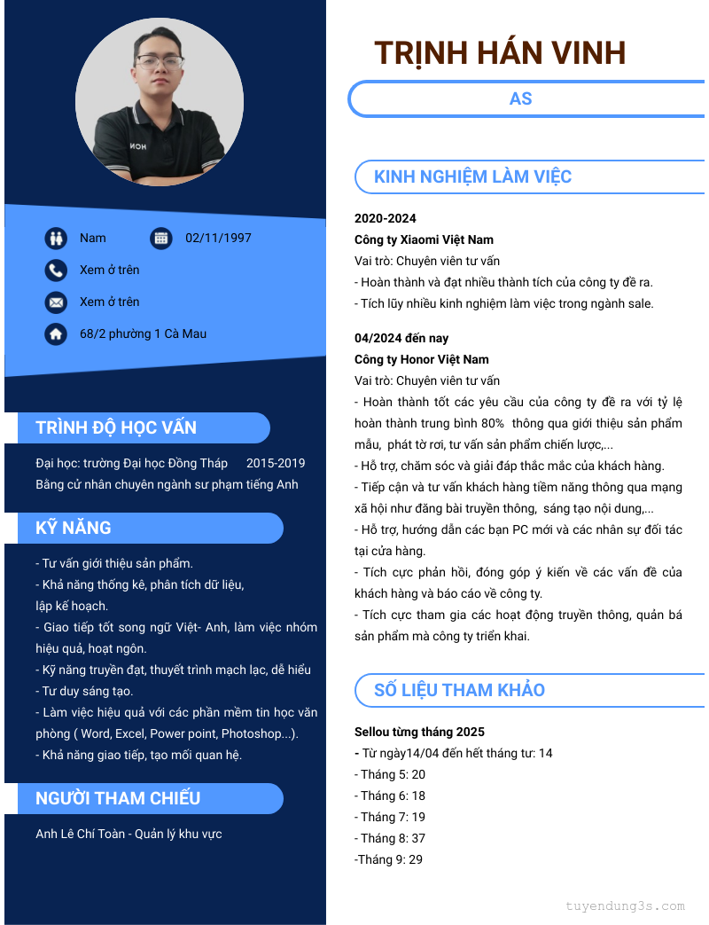 Mở xem thông tin đầy đủ ứng viên Trịnh Hán Vinh chỉ với 2 điểm. Ứng viên được cập nhật ngày 15/10/2025