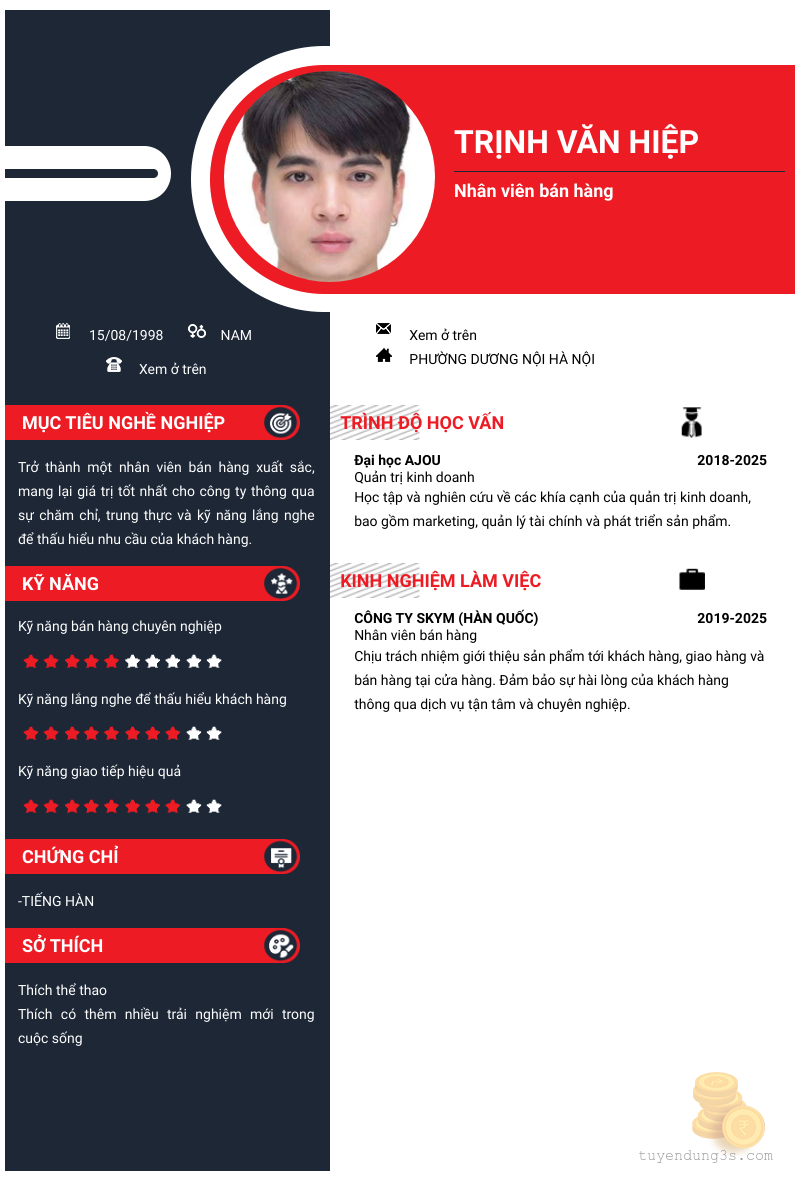 Mở xem thông tin đầy đủ ứng viên TRỊNH VĂN HIỆP chỉ với 2 điểm. Ứng viên được cập nhật ngày 24/12/2025