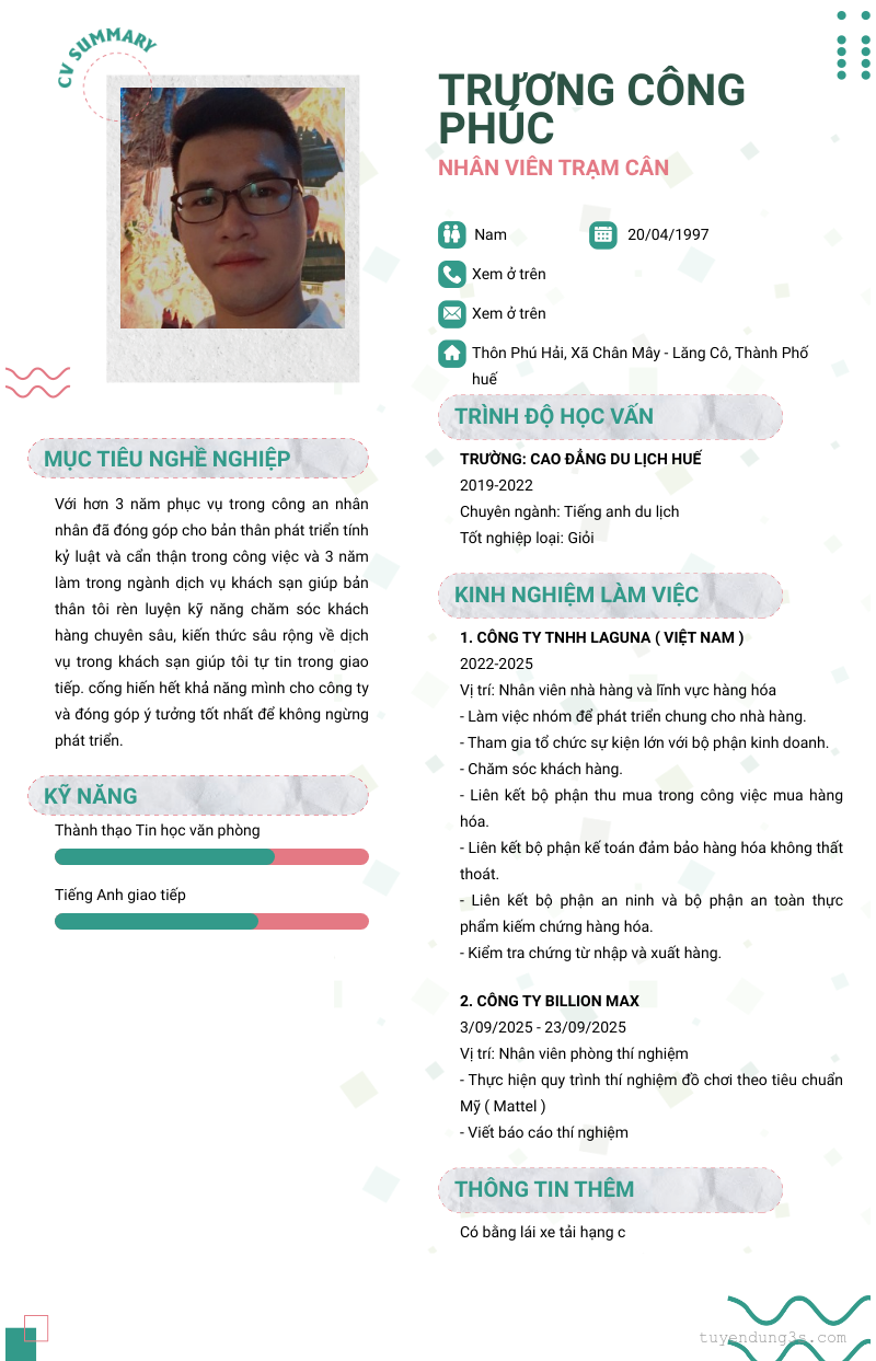 Mở xem thông tin đầy đủ ứng viên Trương Công Phúc chỉ với 2 điểm. Ứng viên được cập nhật ngày 14/10/2025