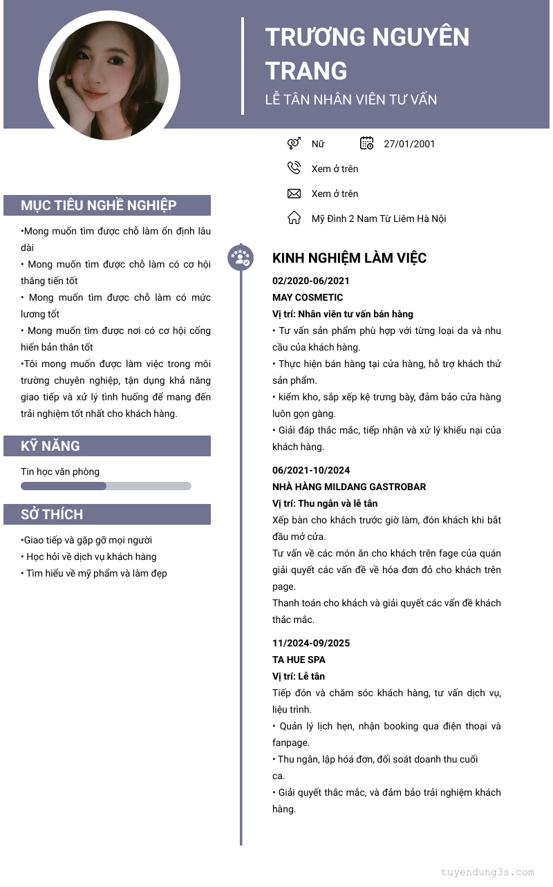 Mở xem thông tin đầy đủ ứng viên Trương Nguyên Trang chỉ với 2 điểm. Ứng viên được cập nhật ngày 30/11/2025