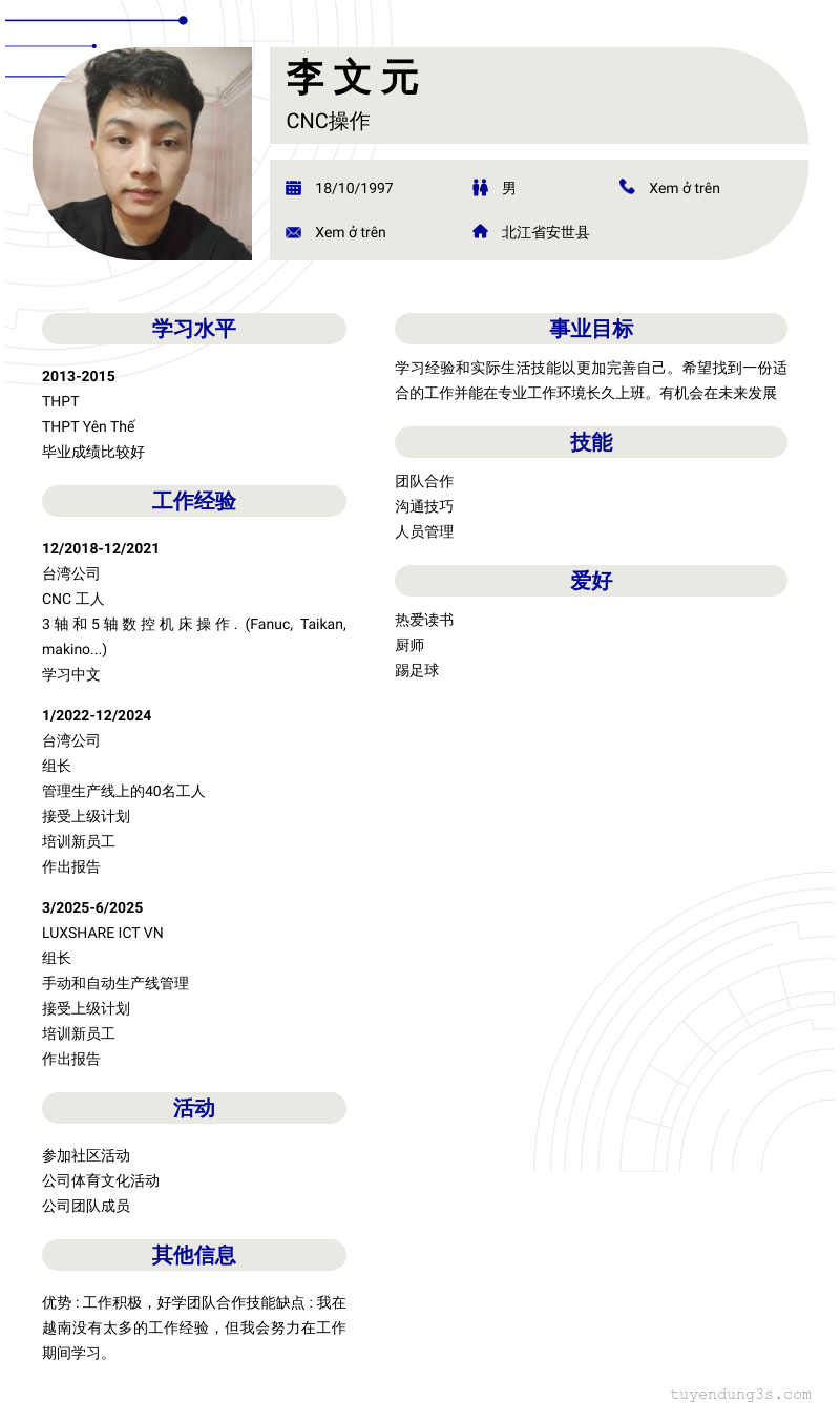 Mở xem thông tin đầy đủ ứng viên 李 文 元 chỉ với 2 điểm. Ứng viên được cập nhật ngày 12/10/2025