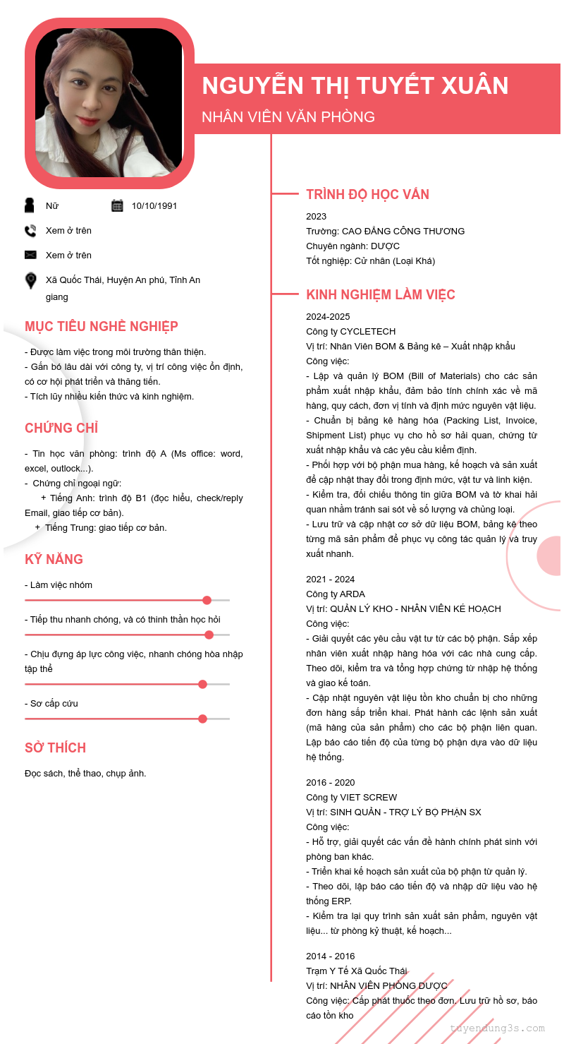 Mở xem thông tin đầy đủ ứng viên 阮氏雪春 chỉ với 2 điểm. Ứng viên được cập nhật ngày 25/10/2025