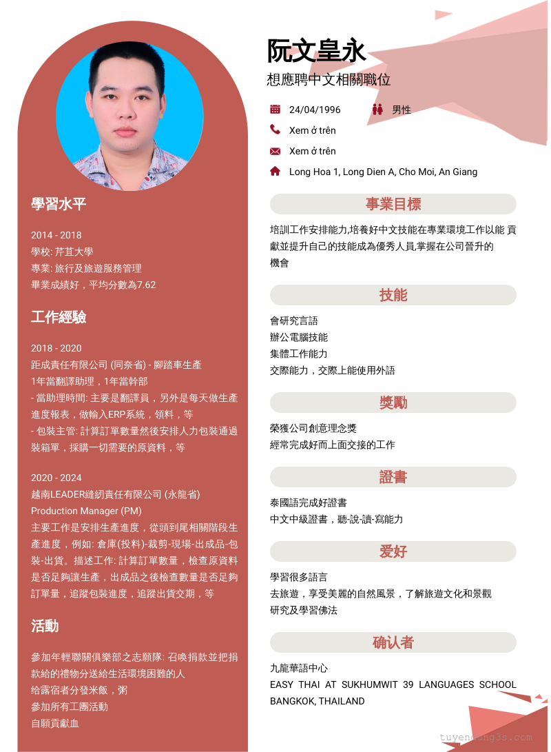 Nơi ở hiện tại: Long Hoa 1, Long Dien A, Cho Moi, An Giang