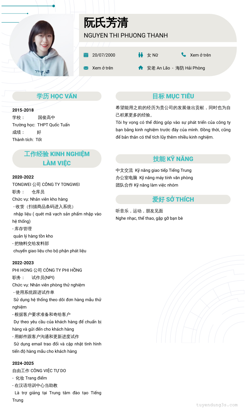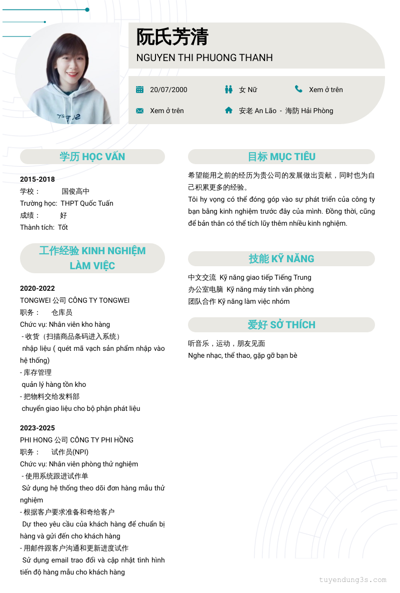 Mở xem thông tin đầy đủ ứng viên 阮氏芳清 chỉ với 2 điểm. Ứng viên được cập nhật ngày 06/03/2025