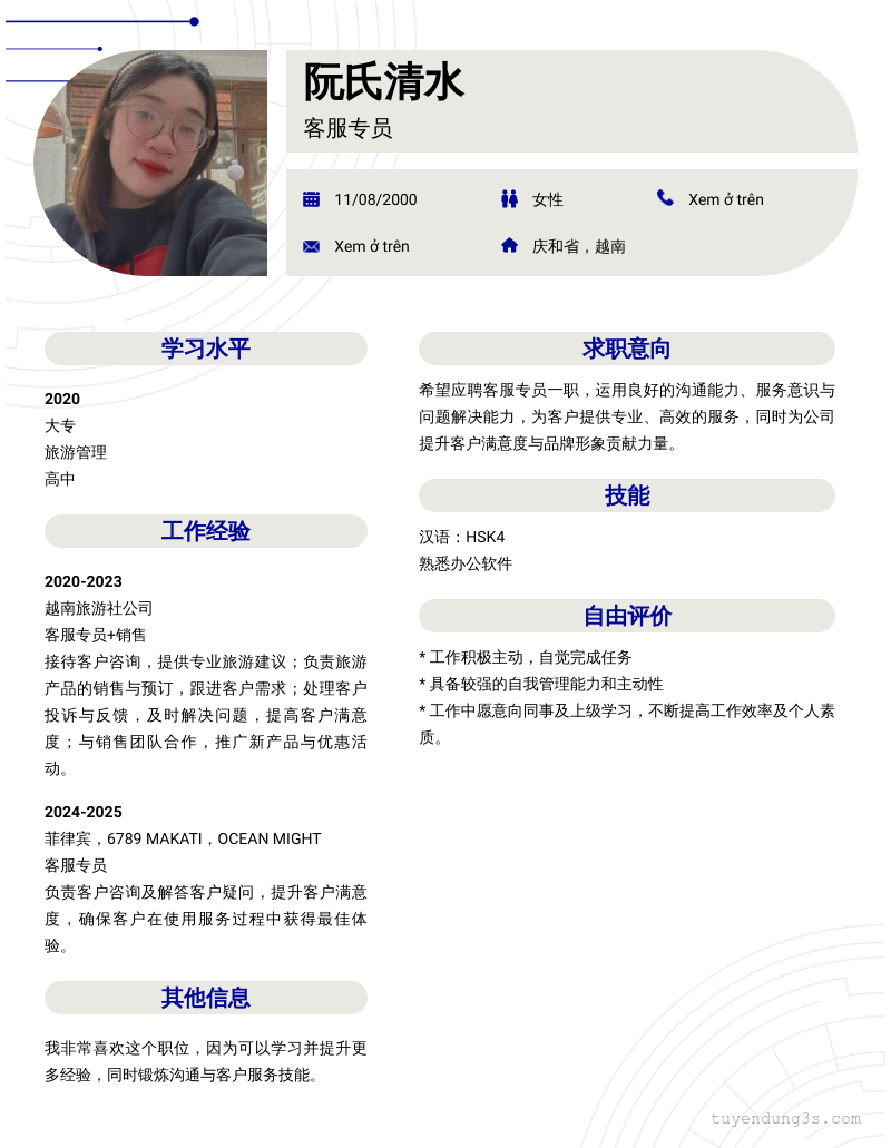 Mở xem thông tin đầy đủ ứng viên 阮氏清水 chỉ với 2 điểm. Ứng viên được cập nhật ngày 04/12/2025