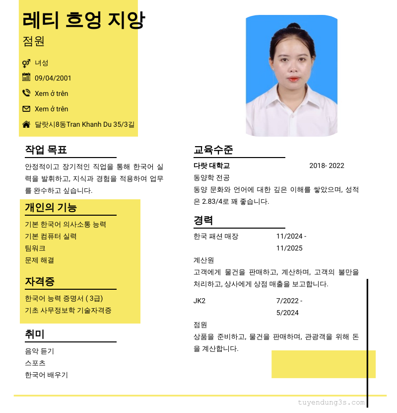 Mở xem thông tin đầy đủ ứng viên 레티 흐엉 지앙 chỉ với 2 điểm. Ứng viên được cập nhật ngày 30/08/2025