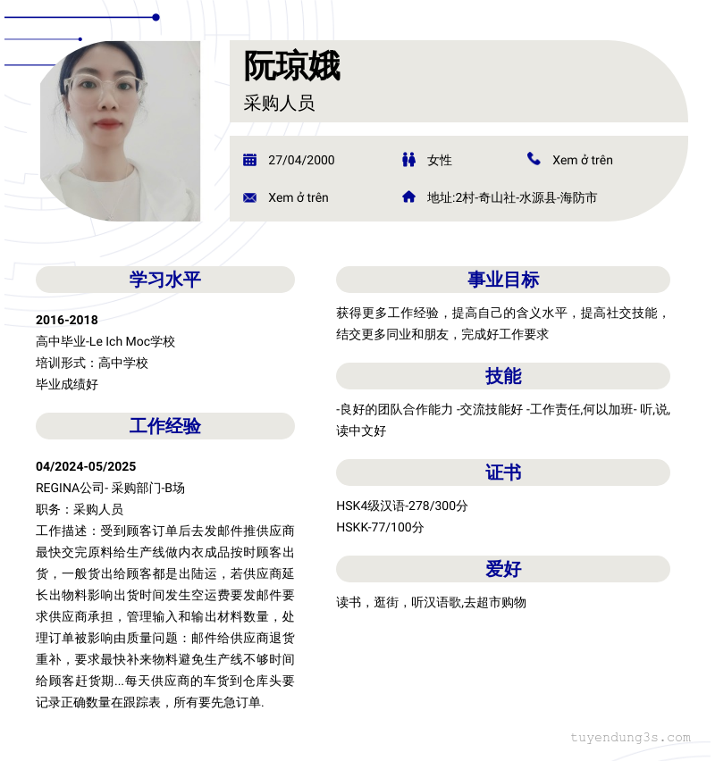Mở xem thông tin đầy đủ ứng viên 阮琼娥 chỉ với 2 điểm. Ứng viên được cập nhật ngày 08/09/2025