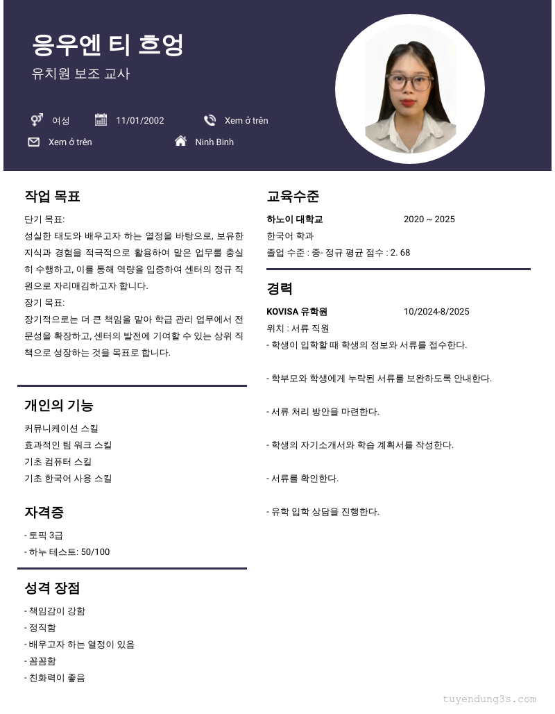 Mở xem thông tin đầy đủ ứng viên 응우엔 티 흐엉 chỉ với 2 điểm. Ứng viên được cập nhật ngày 09/09/2025