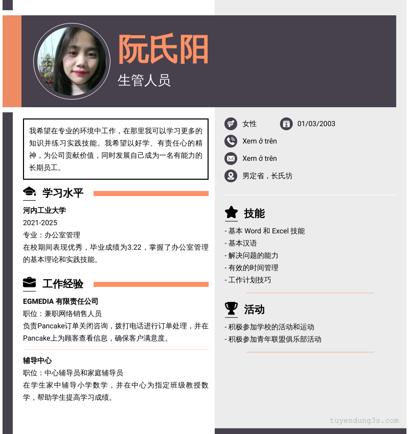 Mở xem thông tin đầy đủ ứng viên 阮氏阳 chỉ với 2 điểm. Ứng viên được cập nhật ngày 02/10/2025