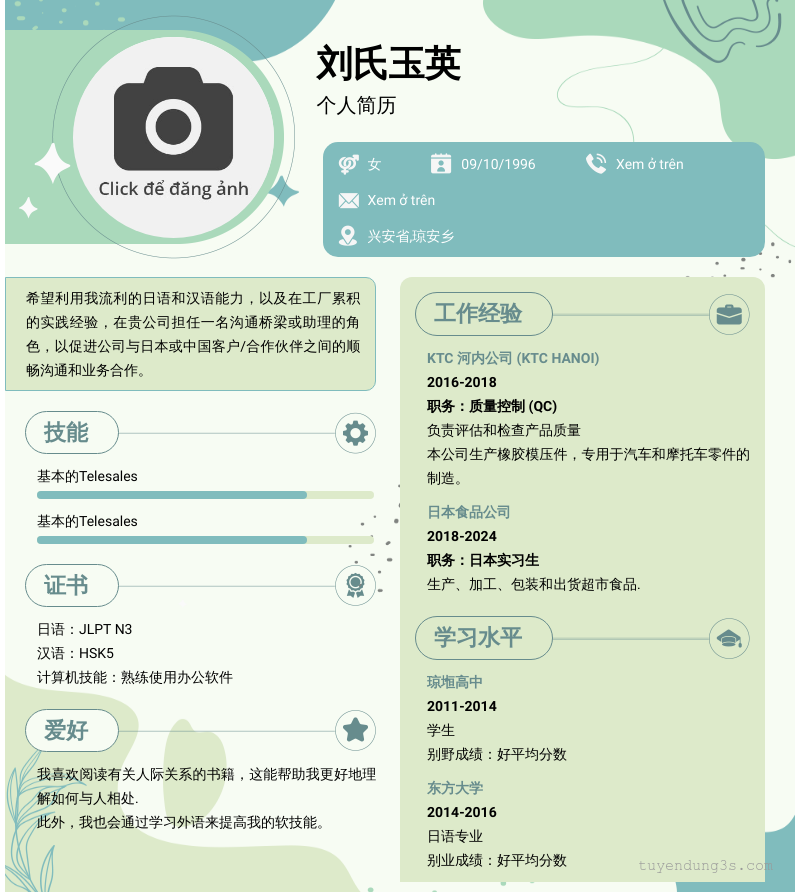 Mở xem thông tin đầy đủ ứng viên 刘氏玉英 chỉ với 2 điểm. Ứng viên được cập nhật ngày 23/09/2025