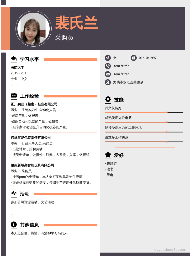 Mở xem thông tin đầy đủ ứng viên 裴氏兰 chỉ với 2 điểm. Ứng viên được cập nhật ngày 02/10/2025