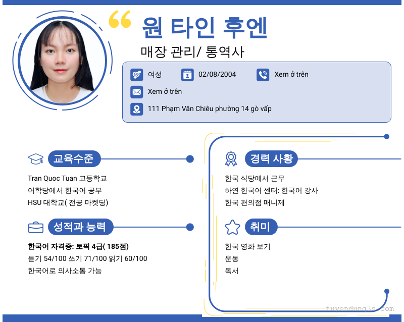 Mở xem thông tin đầy đủ ứng viên 원 타인 후엔 chỉ với 2 điểm. Ứng viên được cập nhật ngày 26/09/2025
