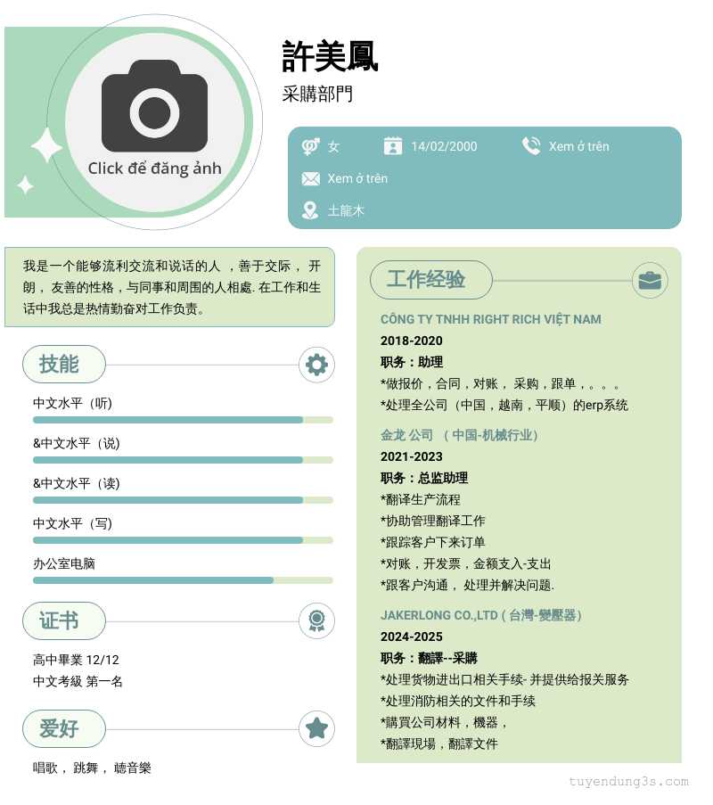 Mở xem thông tin đầy đủ ứng viên 許美鳳 chỉ với 2 điểm. Ứng viên được cập nhật ngày 29/09/2025