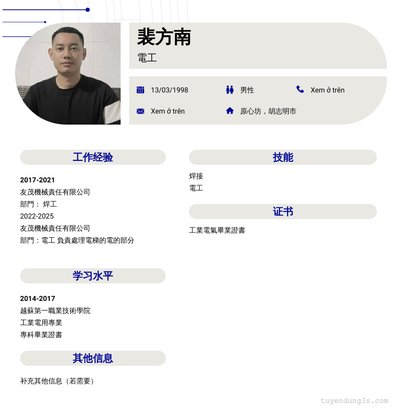 Mở xem thông tin đầy đủ ứng viên 裴方南 chỉ với 2 điểm. Ứng viên được cập nhật ngày 01/10/2025