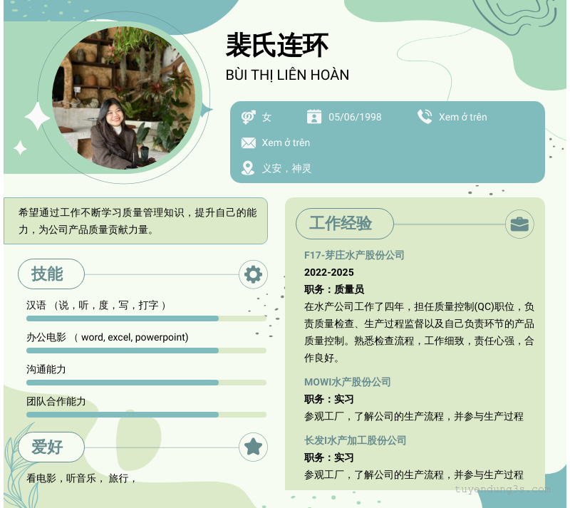 Mở xem thông tin đầy đủ ứng viên 裴氏连环 chỉ với 2 điểm. Ứng viên được cập nhật ngày 05/10/2025