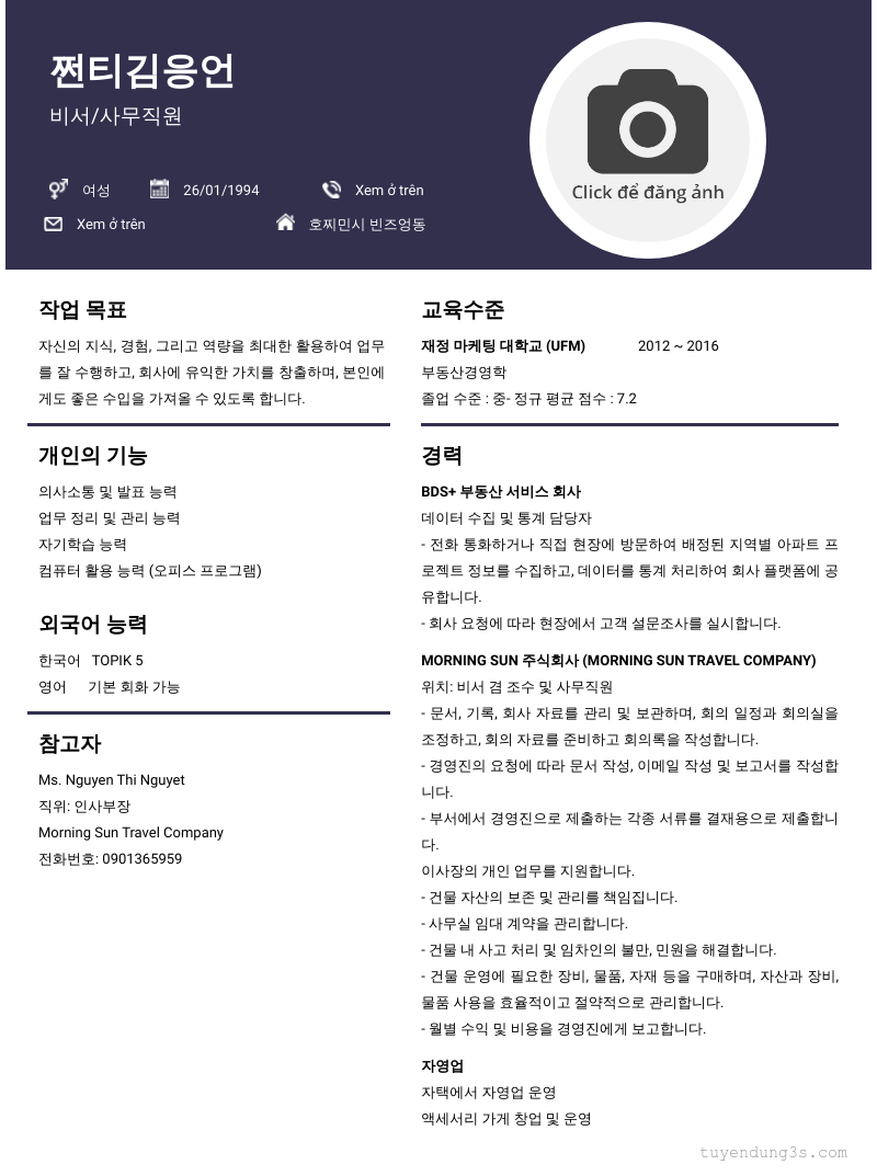 Nơi ở hiện tại: 호찌민시 빈즈엉동