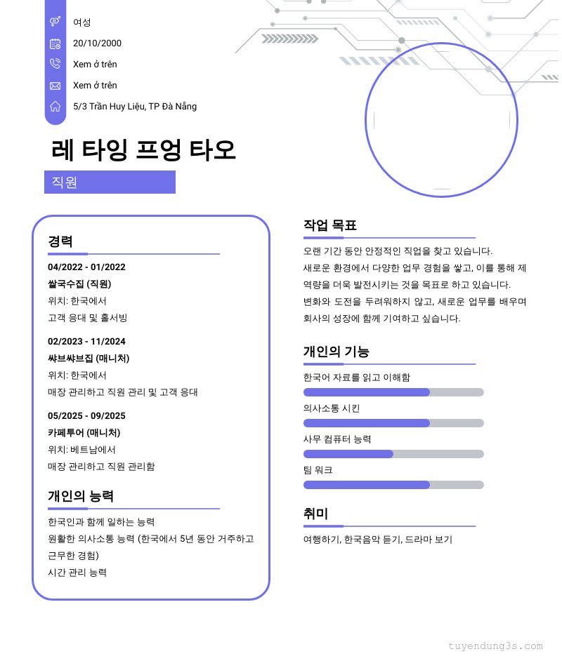 Mở xem thông tin đầy đủ ứng viên 레 타잉 프엉 타오 chỉ với 2 điểm. Ứng viên được cập nhật ngày 21/10/2025