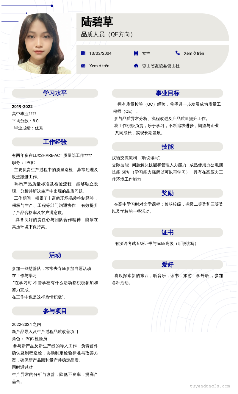 Mở xem thông tin đầy đủ ứng viên 陆碧草 chỉ với 2 điểm. Ứng viên được cập nhật ngày 25/10/2025