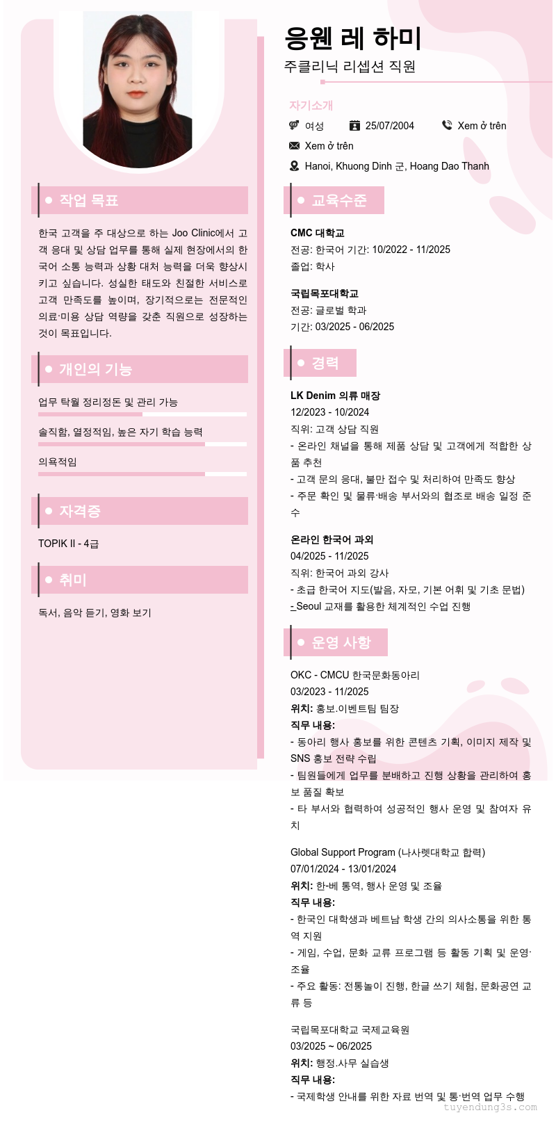 Mở xem thông tin đầy đủ ứng viên 응웬 레 하미 chỉ với 2 điểm. Ứng viên được cập nhật ngày 26/11/2025