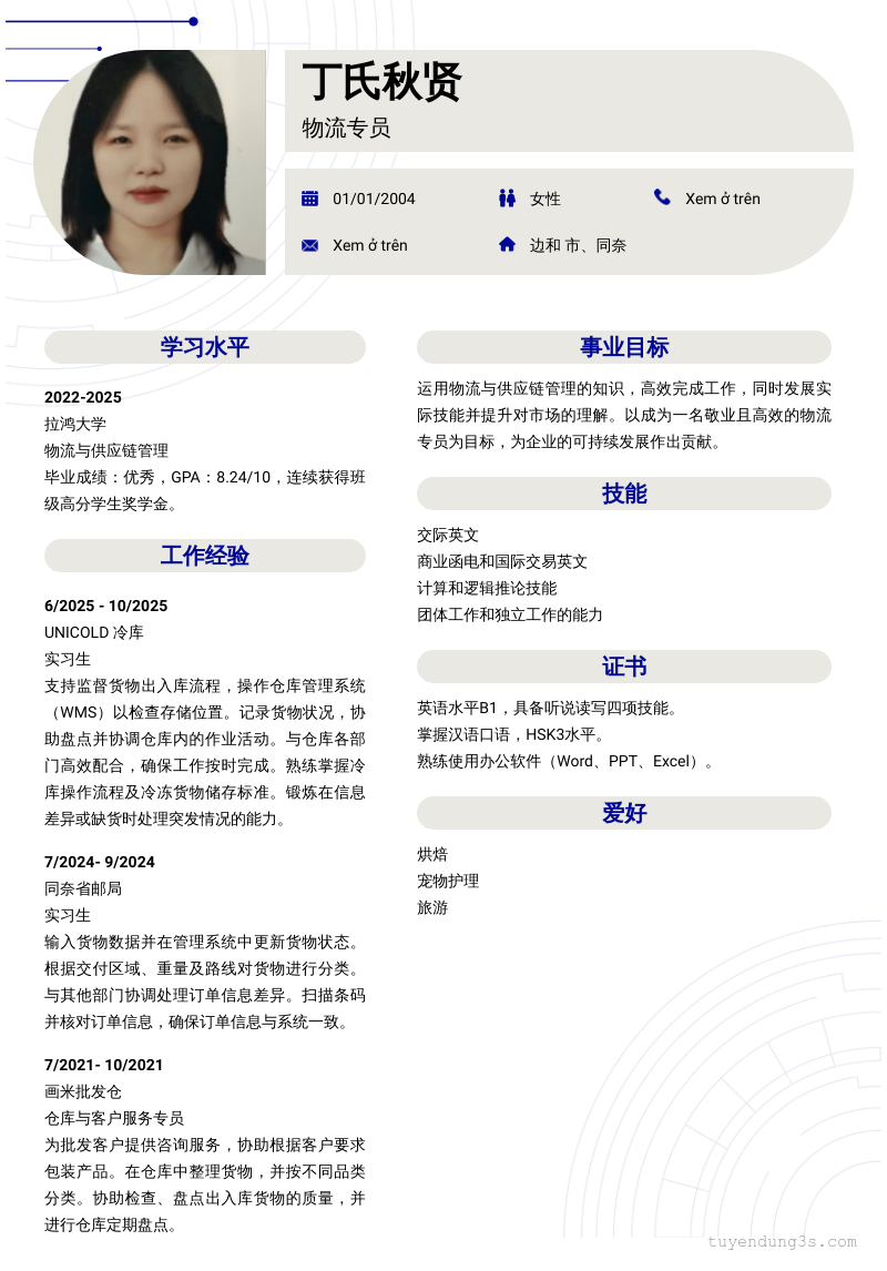 Mở xem thông tin đầy đủ ứng viên 丁氏秋贤 chỉ với 2 điểm. Ứng viên được cập nhật ngày 02/12/2025