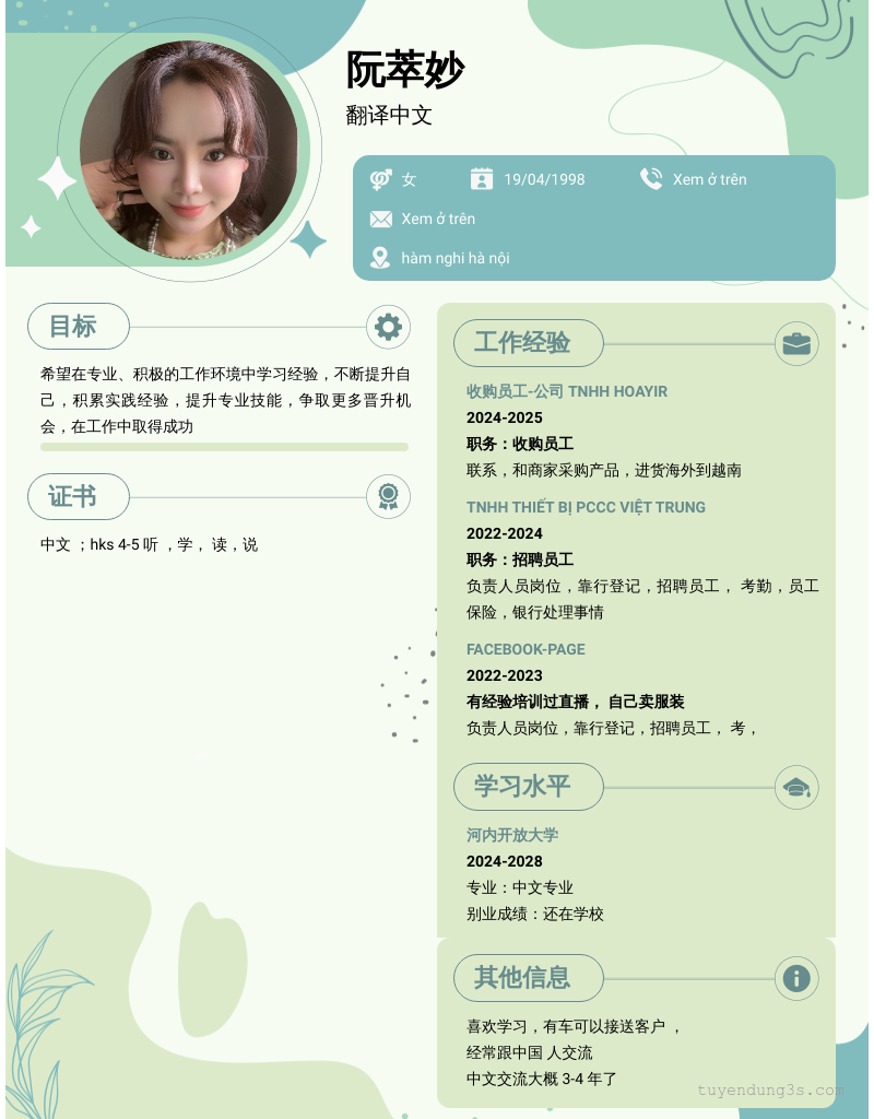 Mở xem thông tin đầy đủ ứng viên 阮萃妙 chỉ với 2 điểm. Ứng viên được cập nhật ngày 10/12/2025