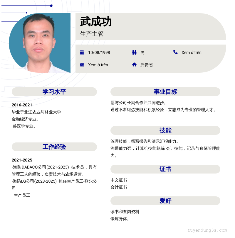 Mở xem thông tin đầy đủ ứng viên 武成功 chỉ với 2 điểm. Ứng viên được cập nhật ngày 18/12/2025