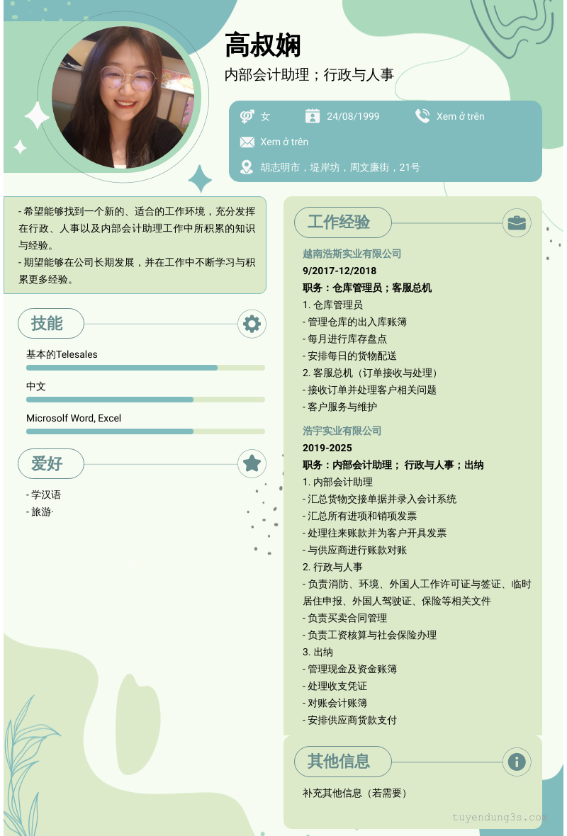 Mở xem thông tin đầy đủ ứng viên 高叔娴 chỉ với 2 điểm. Ứng viên được cập nhật ngày 19/12/2025