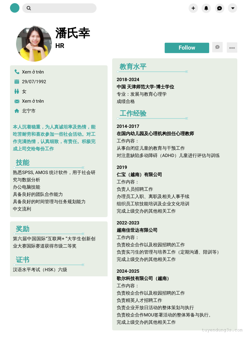 Mở xem thông tin đầy đủ ứng viên 潘氏幸 chỉ với 2 điểm. Ứng viên được cập nhật ngày 19/12/2025