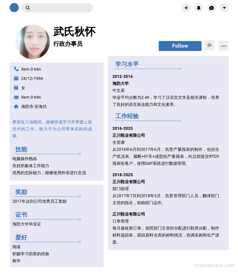 Mở xem thông tin đầy đủ ứng viên 武氏秋怀 chỉ với 2 điểm. Ứng viên được cập nhật ngày 23/12/2025