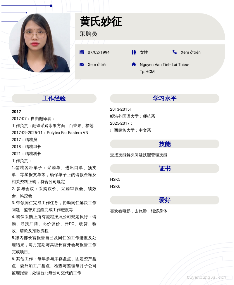 Mở xem thông tin đầy đủ ứng viên 黄氏妙征 chỉ với 2 điểm. Ứng viên được cập nhật ngày 30/12/2025