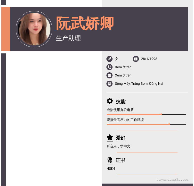 Mở xem thông tin đầy đủ ứng viên 阮武娇卿 chỉ với 2 điểm. Ứng viên được cập nhật ngày 02/01/2026