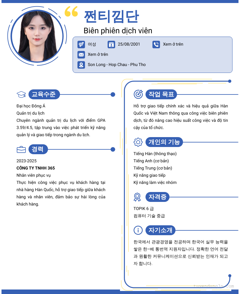 Mở xem thông tin đầy đủ ứng viên 쩐티낌단 chỉ với 2 điểm. Ứng viên được cập nhật ngày 05/01/2026
