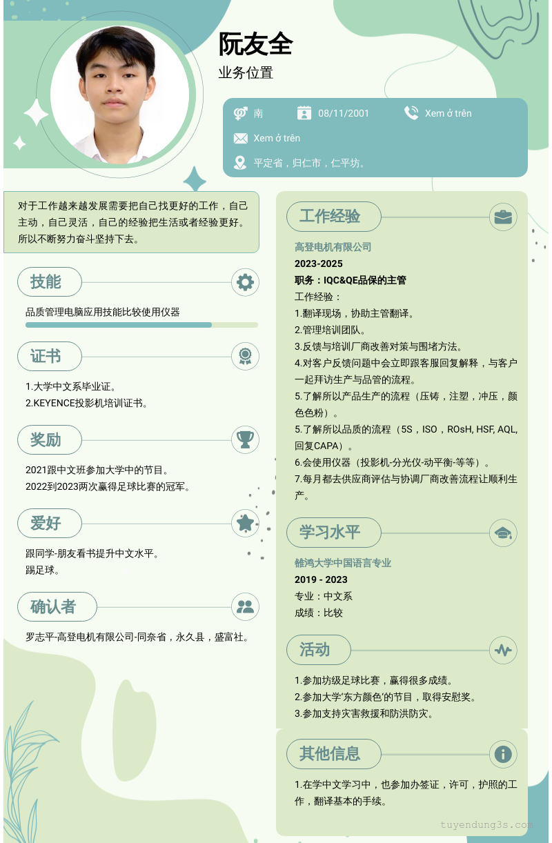 Mở xem thông tin đầy đủ ứng viên 阮友全 chỉ với 2 điểm. Ứng viên được cập nhật ngày 07/01/2026