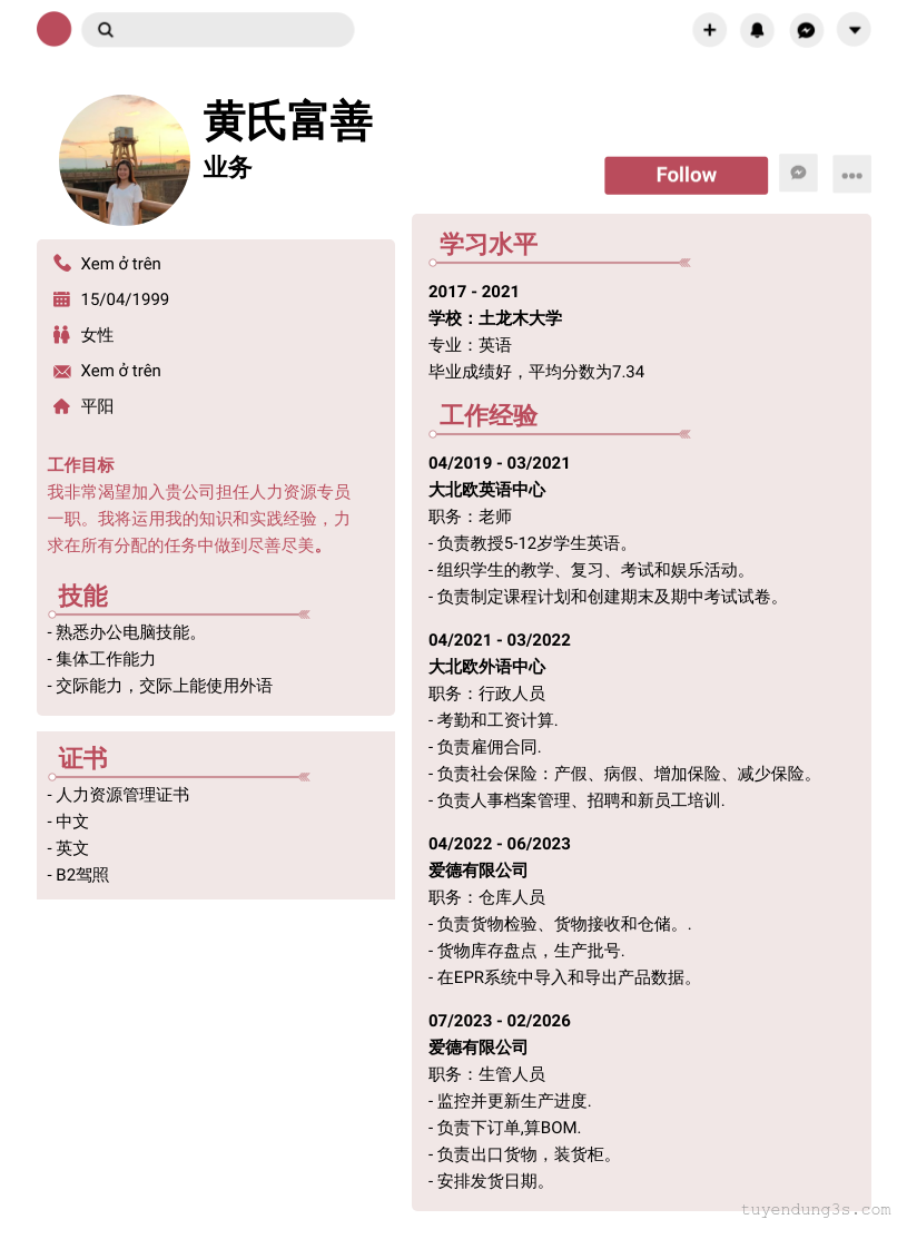 Mở xem thông tin đầy đủ ứng viên 黄氏富善 chỉ với 2 điểm. Ứng viên được cập nhật ngày 23/01/2026