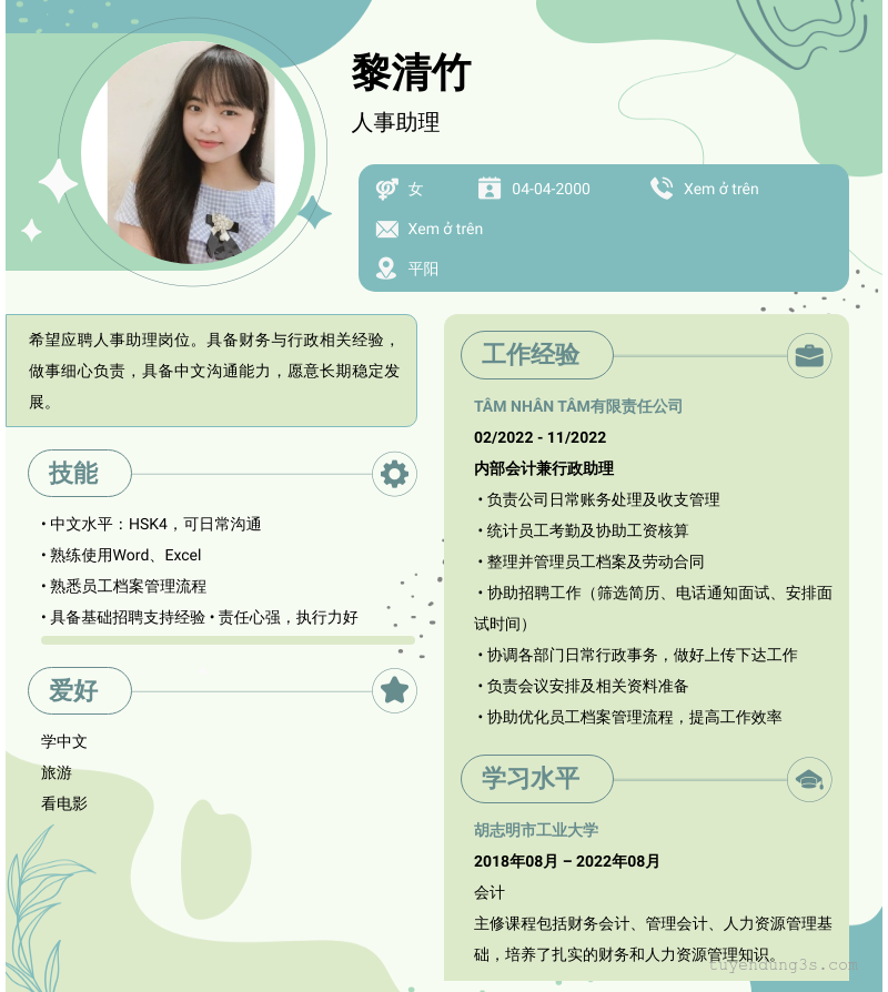Mở xem thông tin đầy đủ ứng viên 黎清竹 chỉ với 2 điểm. Ứng viên được cập nhật ngày 04/03/2026