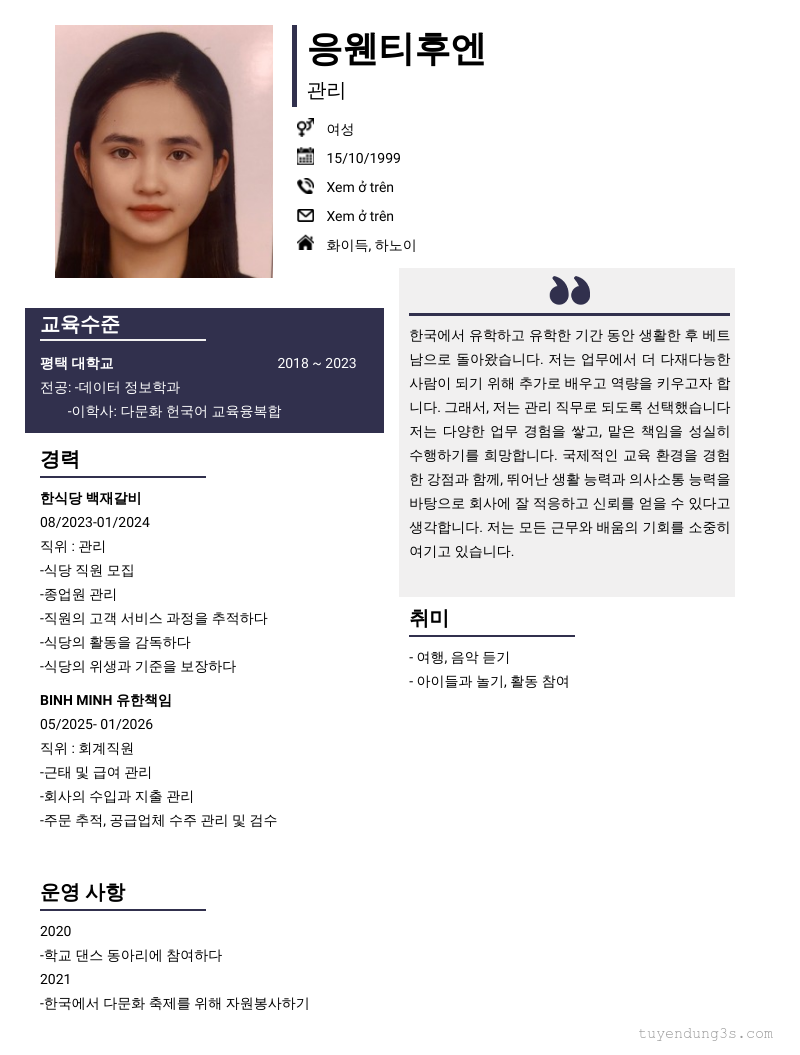 Mở xem thông tin đầy đủ ứng viên 응웬티후엔 chỉ với 2 điểm. Ứng viên được cập nhật ngày 18/03/2026