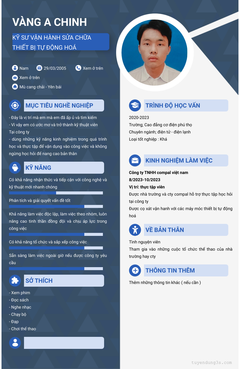 Mở xem thông tin đầy đủ ứng viên Vàng A Chinh chỉ với 2 điểm. Ứng viên được cập nhật ngày 08/03/2024