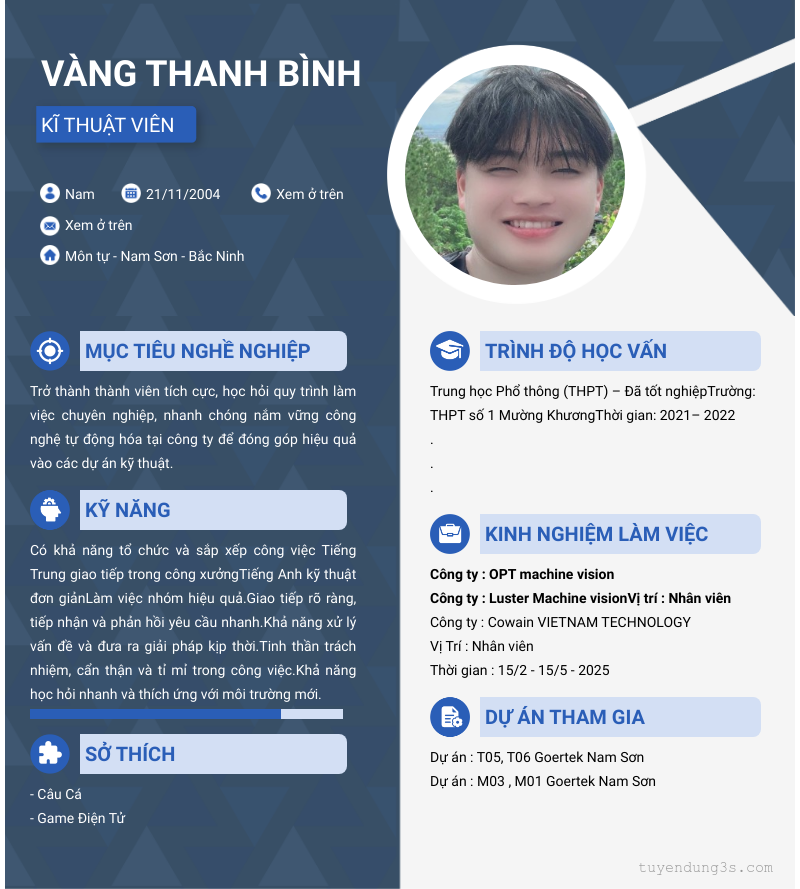 Mở xem thông tin đầy đủ ứng viên VÀNG THANH BÌNH chỉ với 2 điểm. Ứng viên được cập nhật ngày 08/12/2025
