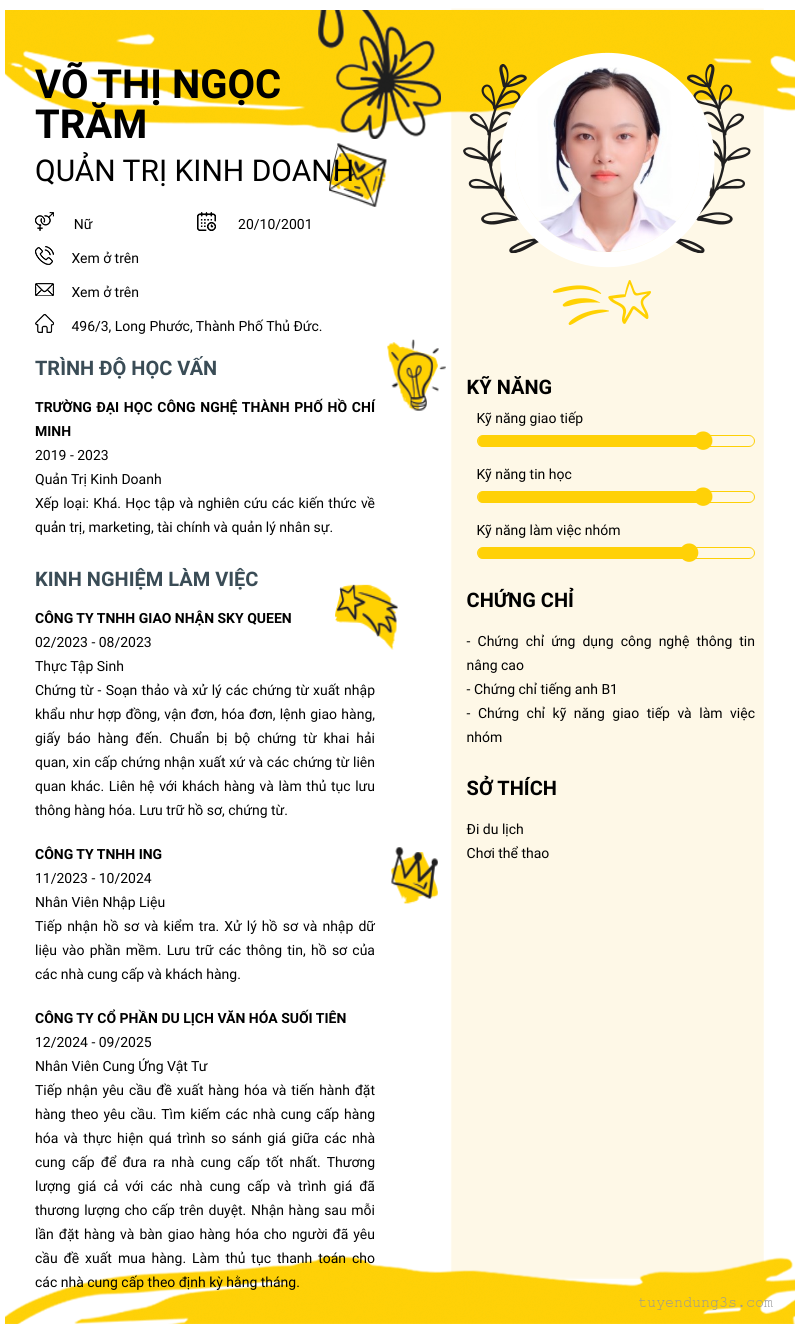 Mở xem thông tin đầy đủ ứng viên Võ Thị Ngọc Trăm chỉ với 2 điểm. Ứng viên được cập nhật ngày 02/10/2025