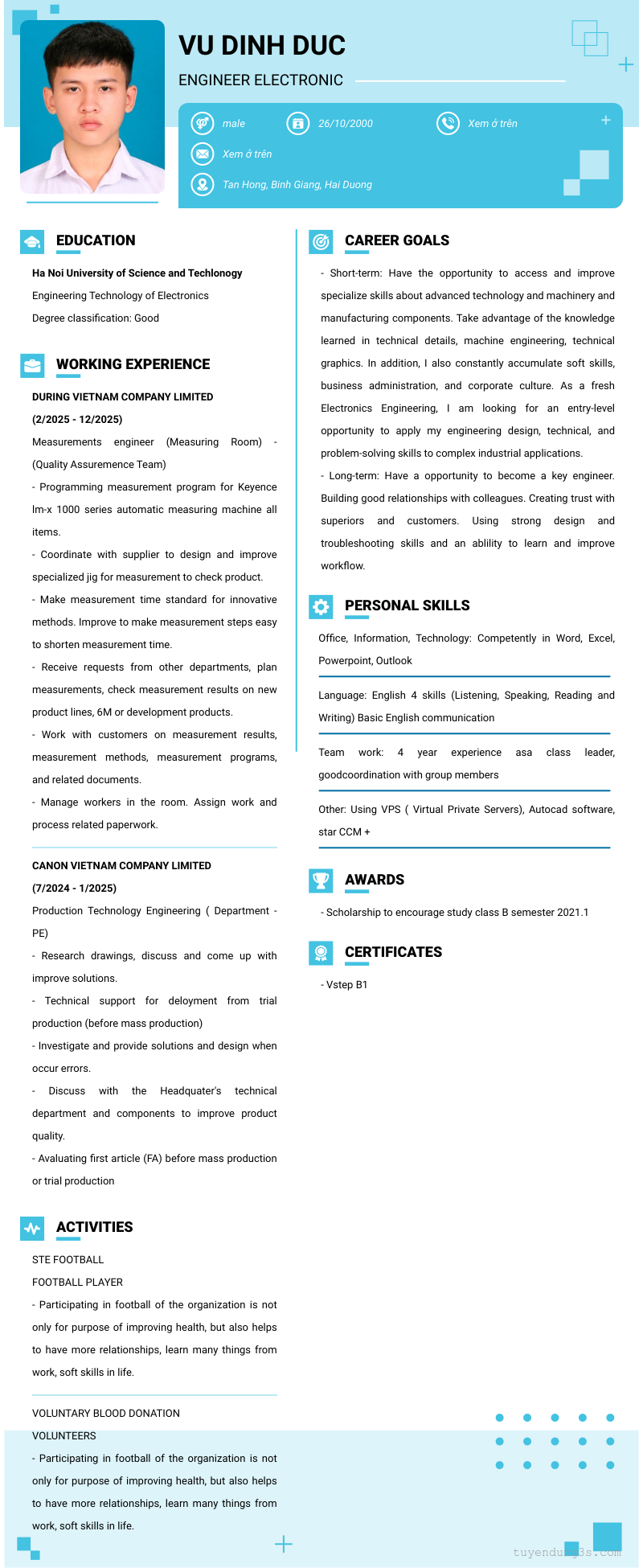 Mở xem thông tin đầy đủ ứng viên Vu Dinh Duc chỉ với 2 điểm. Ứng viên được cập nhật ngày 02/12/2025
