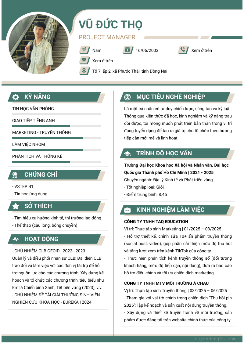 Mở xem thông tin đầy đủ ứng viên VŨ ĐỨC THỌ chỉ với 2 điểm. Ứng viên được cập nhật ngày 29/08/2025