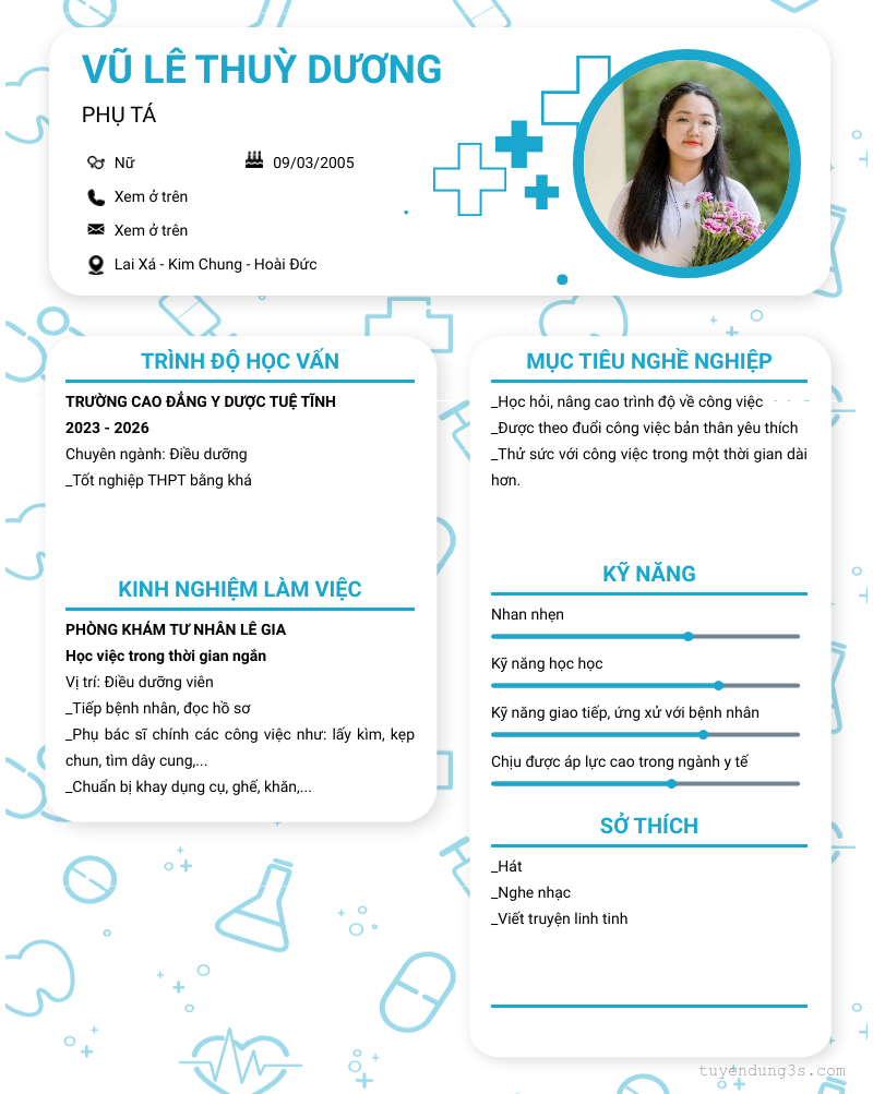 Mở xem thông tin đầy đủ ứng viên Vũ Lê Thuỳ Dương chỉ với 2 điểm. Ứng viên được cập nhật ngày 22/02/2024